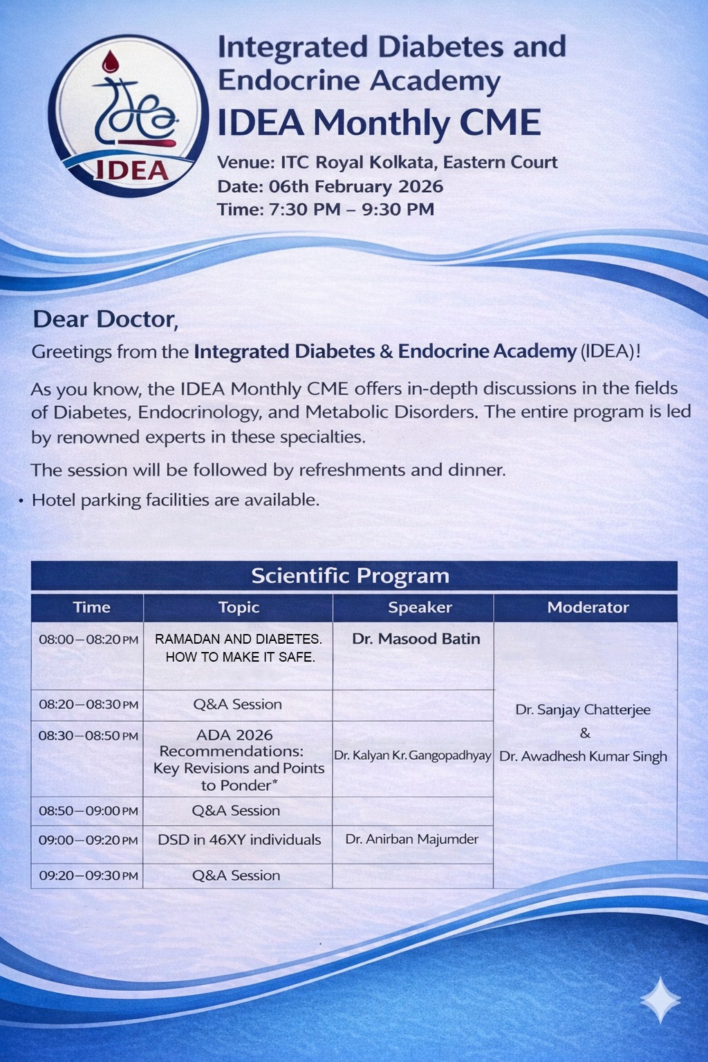 We have immense pleasure in announcing that we have CME’s on the first friday of most month. As you know IDEA monthly CME offers detailed discussions in the fields of Diabetes, Endocrinology and Metabolic Disorders. The entire event is led by leading experts in this field.